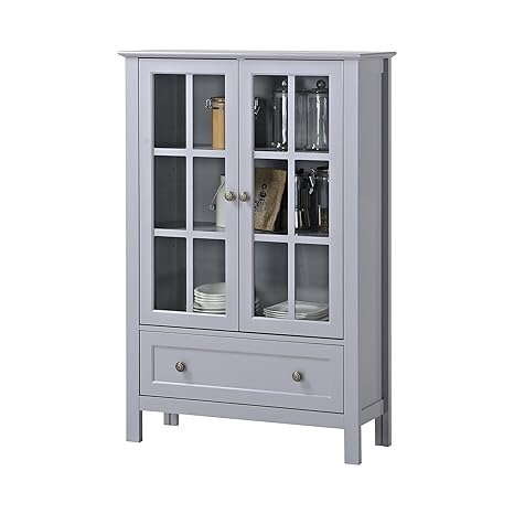 Country Style Modern Double Door Glass Wood Accent Display Storage Cabinet Organizer With Storage Drawer 3 Shelves Living Room Decor Includes